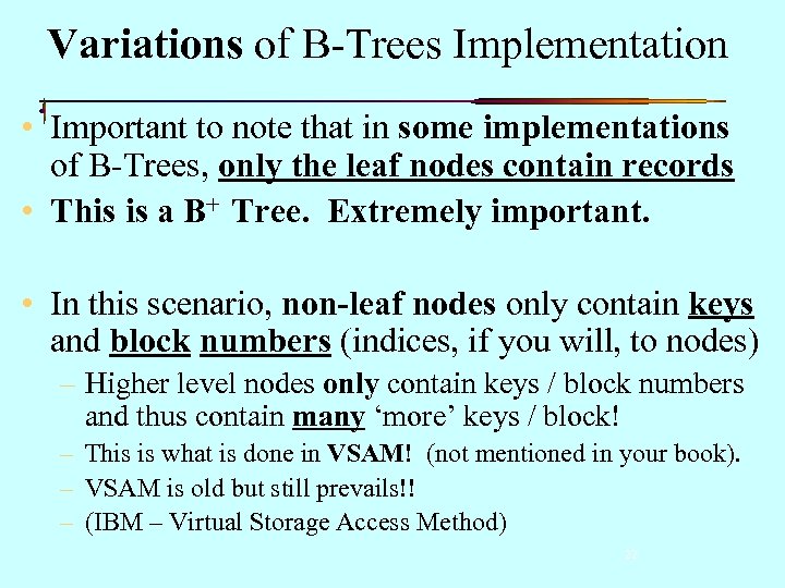 Variations of B-Trees Implementation • Important to note that in some implementations of B-Trees, only the leaf nodes contain records • This is a B+ Tree. Extremely important. • In this scenario, non-leaf nodes only contain keys and block numbers (indices, if you will, to nodes) – Higher level nodes only contain keys / block numbers and thus contain many ‘more’ keys / block! – This is what is done in VSAM! (not mentioned in your book). – VSAM is old but still prevails!! – (IBM – Virtual Storage Access Method) 22