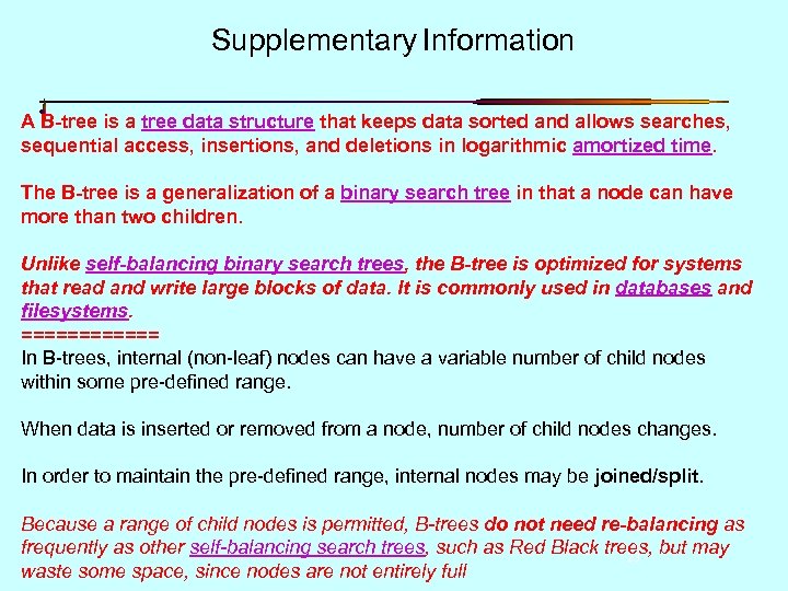 Supplementary Information A B-tree is a tree data structure that keeps data sorted and allows searches, sequential access, insertions, and deletions in logarithmic amortized time. The B-tree is a generalization of a binary search tree in that a node can have more than two children. Unlike self-balancing binary search trees, the B-tree is optimized for systems that read and write large blocks of data. It is commonly used in databases and filesystems. ====== In B-trees, internal (non-leaf) nodes can have a variable number of child nodes within some pre-defined range. When data is inserted or removed from a node, number of child nodes changes. In order to maintain the pre-defined range, internal nodes may be joined/split. Because a range of child nodes is permitted, B-trees do not need re-balancing as frequently as other self-balancing search trees, such as Red Black trees, but may 23 waste some space, since nodes are not entirely full