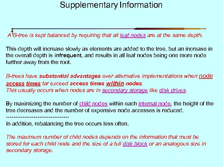 Supplementary Information A B-tree is kept balanced by requiring that all leaf nodes are at the same depth. This depth will increase slowly as elements are added to the tree, but an increase in the overall depth is infrequent, and results in all leaf nodes being one more node further away from the root. B-trees have substantial advantages over alternative implementations when node access times far exceed access times within nodes. This usually occurs when nodes are in secondary storage like disk drives. By maximizing the number of child nodes within each internal node, the height of the tree decreases and the number of expensive node accesses is reduced. -----------------In addition, rebalancing the tree occurs less often. The maximum number of child nodes depends on the information that must be stored for each child node and the size of a full disk block or an analogous size in secondary storage. 24