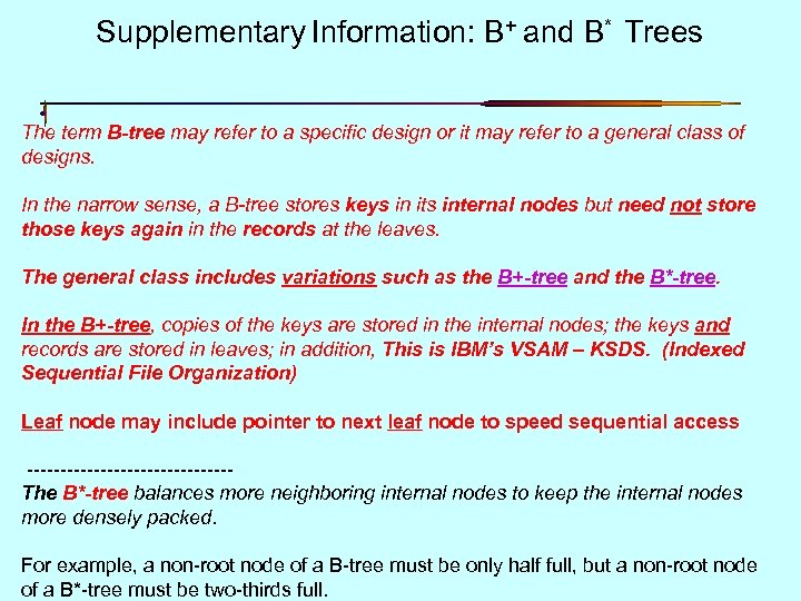 Supplementary Information: B+ and B* Trees The term B-tree may refer to a specific design or it may refer to a general class of designs. In the narrow sense, a B-tree stores keys in its internal nodes but need not store those keys again in the records at the leaves. The general class includes variations such as the B+-tree and the B*-tree. In the B+-tree, copies of the keys are stored in the internal nodes; the keys and records are stored in leaves; in addition, This is IBM’s VSAM – KSDS. (Indexed Sequential File Organization) Leaf node may include pointer to next leaf node to speed sequential access ---------------The B*-tree balances more neighboring internal nodes to keep the internal nodes more densely packed. 25 For example, a non-root node of a B-tree must be only half full, but a non-root node of a B*-tree must be two-thirds full.