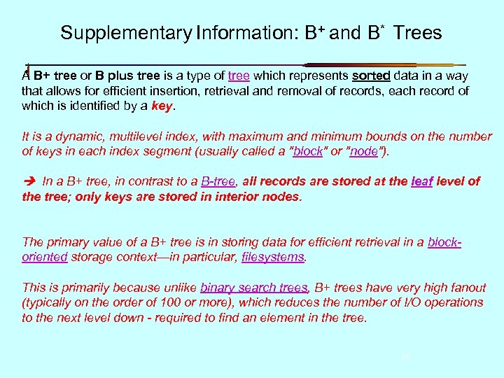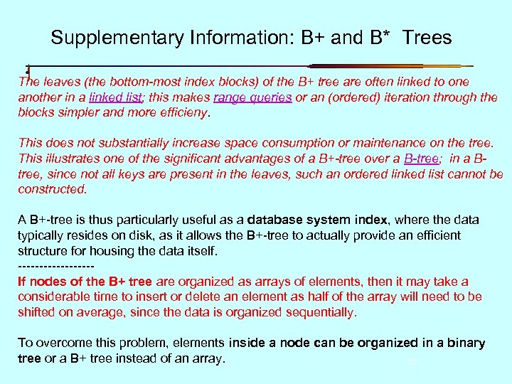 Supplementary Information: B+ and B* Trees The leaves (the bottom-most index blocks) of the B+ tree are often linked to one another in a linked list; this makes range queries or an (ordered) iteration through the blocks simpler and more efficieny. This does not substantially increase space consumption or maintenance on the tree. This illustrates one of the significant advantages of a B+-tree over a B-tree; in a Btree, since not all keys are present in the leaves, such an ordered linked list cannot be constructed. A B+-tree is thus particularly useful as a database system index, where the data typically resides on disk, as it allows the B+-tree to actually provide an efficient structure for housing the data itself. ---------If nodes of the B+ tree are organized as arrays of elements, then it may take a considerable time to insert or delete an element as half of the array will need to be shifted on average, since the data is organized sequentially. To overcome this problem, elements inside a node can be organized in a binary tree or a B+ tree instead of an array. 27