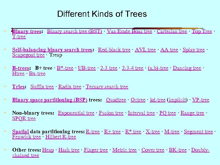 Different Kinds of Trees • Binary trees: Binary search tree (BST) · Van Emde Boas tree · Cartesian tree · Top Tree · T-tree • Self-balancing binary search trees: Red-black tree · AVL tree · AA tree · Splay tree · Scapegoat tree · Treap • B-trees: B+ tree · B*-tree · UB-tree · 2 -3 -4 tree · (a, b)-tree · Dancing tree · Htree · Bx-tree • Tries: Suffix tree · Radix tree · Ternary search tree • Binary space partitioning (BSP) trees: Quadtree · Octree · kd-tree (implicit) · VP-tree • Non-binary trees: Exponential tree · Fusion tree · Interval tree · PQ tree · Range tree · SPQR tree • Spatial data partitioning trees: R-tree · R+ tree · R* tree · X-tree · M-tree · Segment tree · Fenwick tree · Hilbert R-tree • Other trees: Heap · Hash tree · Finger tree · Metric tree · Cover tree · BK-tree · Doubly 28 chained tree