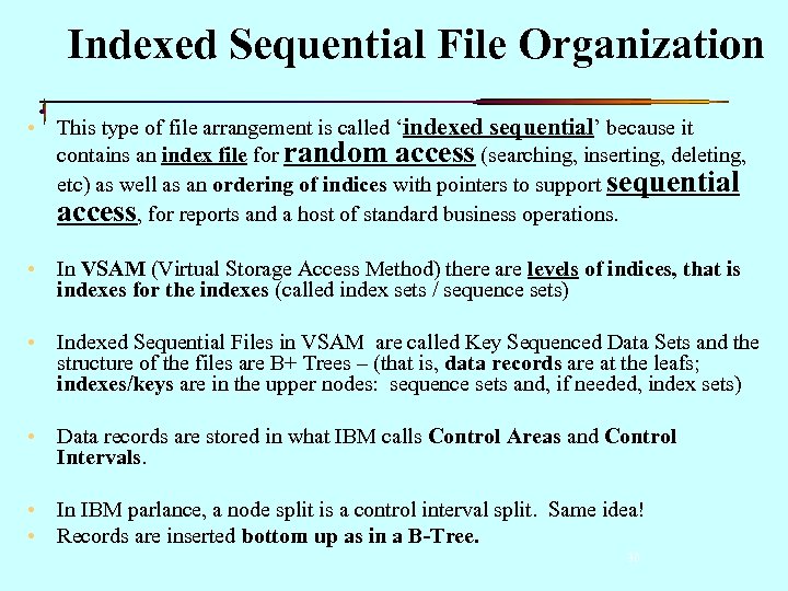 Indexed Sequential File Organization • This type of file arrangement is called ‘indexed sequential’ because it contains an index file for random access (searching, inserting, deleting, etc) as well as an ordering of indices with pointers to support sequential access, for reports and a host of standard business operations. • In VSAM (Virtual Storage Access Method) there are levels of indices, that is indexes for the indexes (called index sets / sequence sets) • Indexed Sequential Files in VSAM are called Key Sequenced Data Sets and the structure of the files are B+ Trees – (that is, data records are at the leafs; indexes/keys are in the upper nodes: sequence sets and, if needed, index sets) • Data records are stored in what IBM calls Control Areas and Control Intervals. • In IBM parlance, a node split is a control interval split. Same idea! • Records are inserted bottom up as in a B-Tree. 30