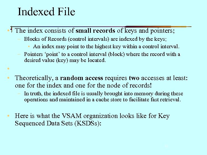 Indexed File • The index consists of small records of keys and pointers; – Blocks of Records (control intervals) are indexed by the keys; • An index may point to the highest key within a control interval. – Pointers ‘point’ to a control interval (block) where the record with a desired value (key) may be located. • • Theoretically, a random access requires two accesses at least: one for the index and one for the node of records! – In truth, the indexed file is usually brought into memory during these operations and maintained in a cache store to facilitate fast retrieval. • Here is what the VSAM organization looks like for Key Sequenced Data Sets (KSDSs): 31