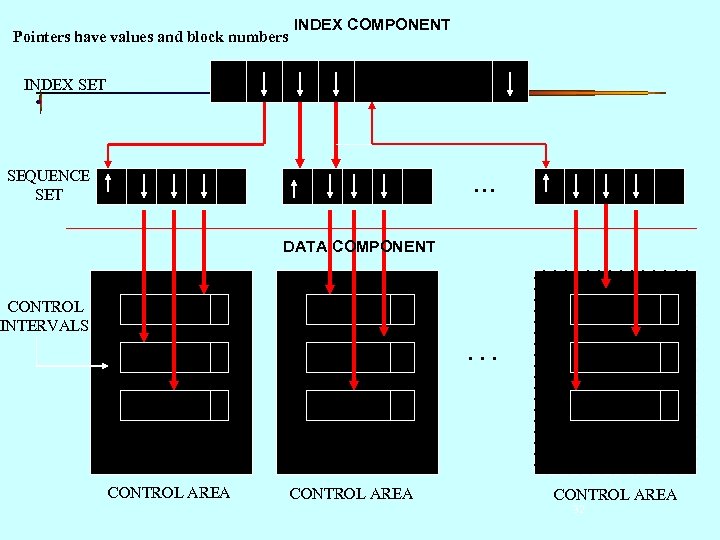Pointers have values and block numbers INDEX COMPONENT … INDEX SET SEQUENCE SET . . . DATA COMPONENT CONTROL INTERVALS . . . CONTROL AREA 32