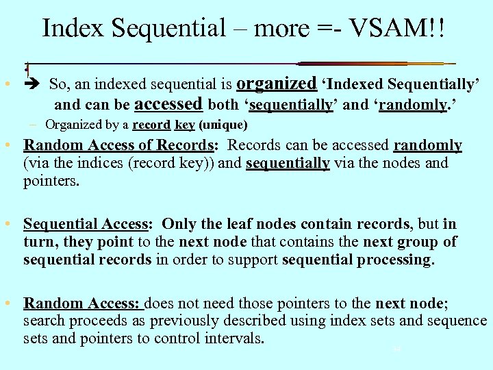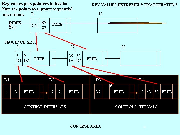 Key values plus pointers to blocks Note the points to support sequential I 1 operations. INDEX SET 62 9/S 1 S 2 D 1 I 2 FREE SEQUENCE SETS S 1 3 9 D 1 D 2 KEY VALUES EXTREMELY EXAGGERATED!! S 2 36 62 D 3 D 4 FREE D 2 S 3 FREE D 3 D 4 36 1 3 FREE 5 9 FREE 35 CONTROL INTERVALS FREE 42 43 62 FREE CONTROL INTERVALS CONTROL AREA 33
