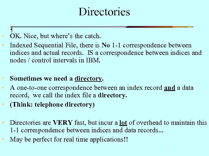 Directories • OK. Nice, but where’s the catch. • Indexed Sequential File, there is No 1 -1 correspondence between indices and actual records. IS a correspondence between indices and nodes / control intervals in IBM. • Sometimes we need a directory. • A one-to-one correspondence between an index record and a data record, we call the index file a directory. • (Think: telephone directory) • Directories are VERY fast, but incur a lot of overhead to maintain this 1 -1 correspondence between indices and data records. . . • May be perfect for real time applications!! 35