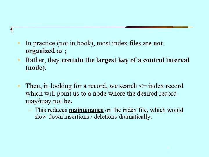 • In practice (not in book), most index files are not organized as ; • Rather, they contain the largest key of a control interval (node). • Then, in looking for a record, we search <= index record which will point us to a node where the desired record may/may not be. – This reduces maintenance on the index file, which would slow down insertions / deletions dramatically. 36