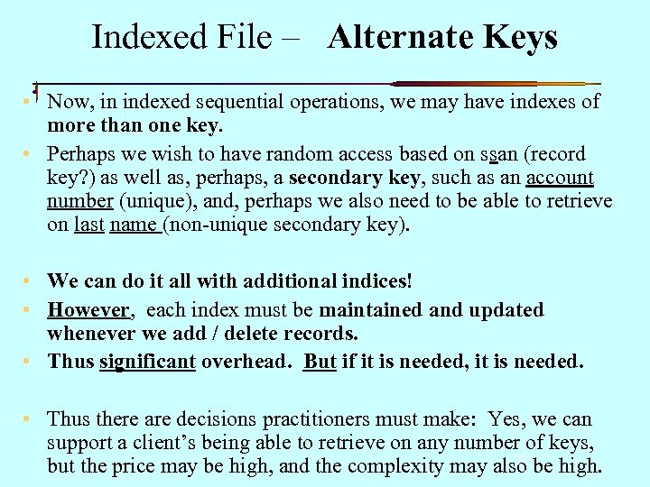 Indexed File – Alternate Keys • Now, in indexed sequential operations, we may have indexes of more than one key. • Perhaps we wish to have random access based on ssan (record key? ) as well as, perhaps, a secondary key, such as an account number (unique), and, perhaps we also need to be able to retrieve on last name (non-unique secondary key). • We can do it all with additional indices! • However, each index must be maintained and updated whenever we add / delete records. • Thus significant overhead. But if it is needed, it is needed. • Thus there are decisions practitioners must make: Yes, we can support a client’s being able to retrieve on any number of keys, 37 but the price may be high, and the complexity may also be high.