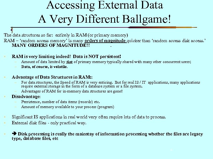 Accessing External Data A Very Different Ballgame! The data structures so far: entirely in RAM (or primary memory) RAM – ‘random access memory’ is many orders of magnitude quicker than ‘random access disk access. ’ MANY ORDERS OF MAGNITUDE!!. • RAM is very limiting indeed! Data is NOT persistent! – – • Advantage of Data Structures in RAM: : – – • Amount of data limited by size of primary memory typically shared with many other concurrent users; Data, of course, is volatile. For data structures, the Speed of RAM is very enticing. But for real IS / IT applications, many applications require external storage in the form of a database system or a file system. Advantages of RAM for in-memory data structures are gone! Disadvantage: – – Persistence, number of data items (records) etc. Amount of memory available to your process (program) • • Significant IS applications in real world very often require lots of data to process. External disk files - only practical way. • Disk processing is really the mainstay of information processing whether the files are legacy type, database files, etc 4