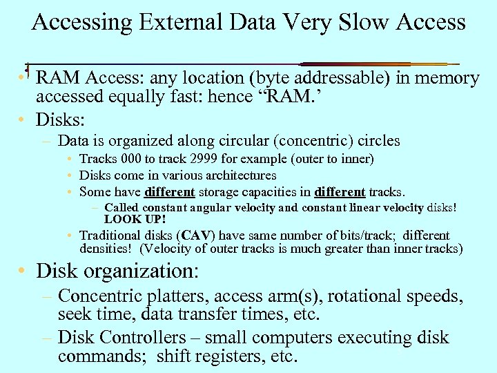 Accessing External Data Very Slow Access • RAM Access: any location (byte addressable) in memory accessed equally fast: hence “RAM. ’ • Disks: – Data is organized along circular (concentric) circles • Tracks 000 to track 2999 for example (outer to inner) • Disks come in various architectures • Some have different storage capacities in different tracks. – Called constant angular velocity and constant linear velocity disks! LOOK UP! • Traditional disks (CAV) have same number of bits/track; different densities! (Velocity of outer tracks is much greater than inner tracks) • Disk organization: – Concentric platters, access arm(s), rotational speeds, seek time, data transfer times, etc. – Disk Controllers – small computers executing disk 5 commands; shift registers, etc.