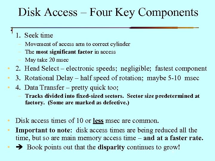 Disk Access – Four Key Components 1. Seek time – Movement of access arm to correct cylinder – The most significant factor in access – May take 20 msec • 2. Head Select – electronic speeds; negligible; fastest component • 3. Rotational Delay – half speed of rotation; maybe 5 -10 msec • 4. Data Transfer – pretty quick too; – Tracks divided into fixed-sized sectors. Sector size predetermined at factory. (Some are marked as defective. ) • Disk access times of 10 or less msec are common. • Important to note: disk access times are being reduced all the time, but so are main memory access time – and at a faster rate. • Book points out that the disparity continues to grow! 6
