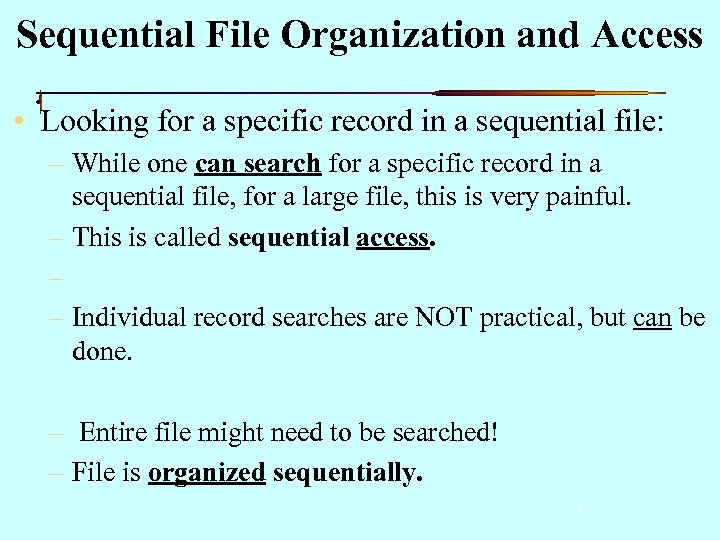 Sequential File Organization and Access • Looking for a specific record in a sequential file: – While one can search for a specific record in a sequential file, for a large file, this is very painful. – This is called sequential access. – – Individual record searches are NOT practical, but can be done. – Entire file might need to be searched! – File is organized sequentially. 7