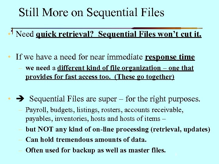 More on Sequential Files • Sequential files are great for reporting, printing / displaying information, etc. , but not for on-line retrieval of records!! • Insertions? Book does a poor job here. – While it is true that conceptually inserting a record into an existing file would require all records to be ‘moved’ forward (assuming the blocks are full), in practice this is often NOT done because the file would not be available for online access during this physical update! • Sequential files are NOT USED for online processing. • Transactions may be batched up during the day and the file is typically updated one time and offline – (Note: no one can access the file during updating) prior to generating end-of-day reports, exception reporting, summary reports, inventory reports, sales reports, statistical reports, listings, etc. if required. . . 8