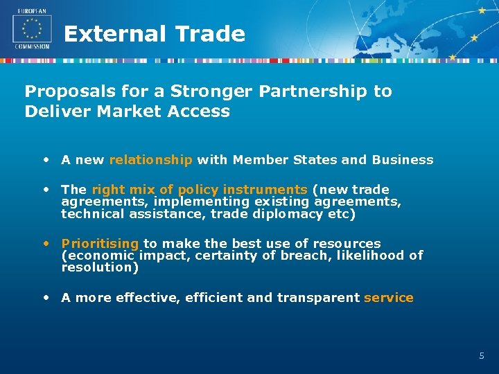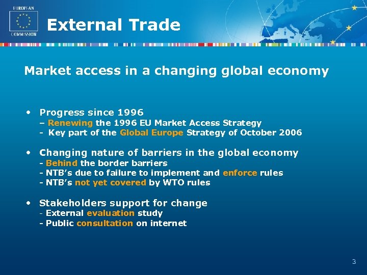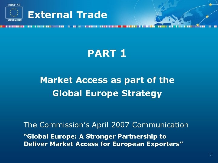 External Trade PART 1 Market Access as part of the Global Europe Strategy The Commission’s April 2007 Communication “Global Europe: A Stronger Partnership to Deliver Market Access for European Exporters” 2