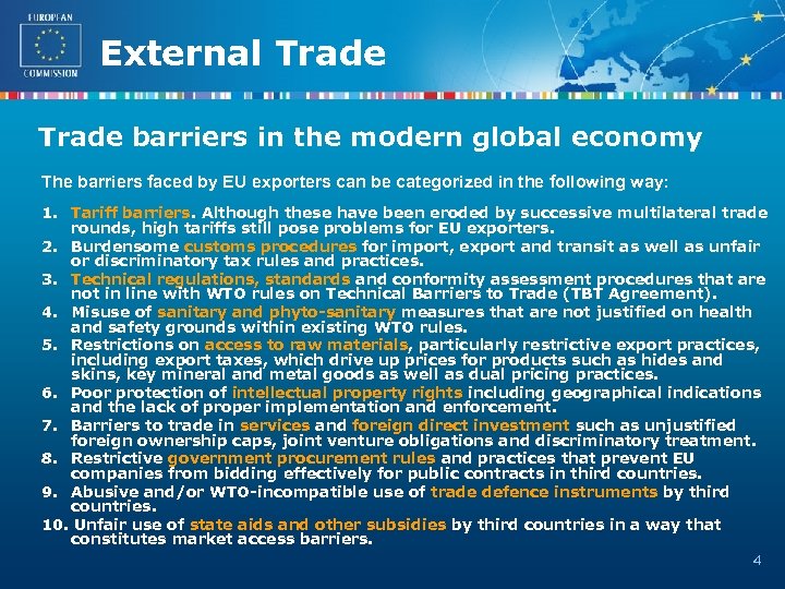 External Trade barriers in the modern global economy The barriers faced by EU exporters can be categorized in the following way: 1. Tariff barriers. Although these have been eroded by successive multilateral trade rounds, high tariffs still pose problems for EU exporters. 2. Burdensome customs procedures for import, export and transit as well as unfair or discriminatory tax rules and practices. 3. Technical regulations, standards and conformity assessment procedures that are not in line with WTO rules on Technical Barriers to Trade (TBT Agreement). 4. Misuse of sanitary and phyto-sanitary measures that are not justified on health and safety grounds within existing WTO rules. 5. Restrictions on access to raw materials, particularly restrictive export practices, including export taxes, which drive up prices for products such as hides and skins, key mineral and metal goods as well as dual pricing practices. 6. Poor protection of intellectual property rights including geographical indications and the lack of proper implementation and enforcement. 7. Barriers to trade in services and foreign direct investment such as unjustified foreign ownership caps, joint venture obligations and discriminatory treatment. 8. Restrictive government procurement rules and practices that prevent EU companies from bidding effectively for public contracts in third countries. 9. Abusive and/or WTO-incompatible use of trade defence instruments by third countries. 10. Unfair use of state aids and other subsidies by third countries in a way that constitutes market access barriers. 4