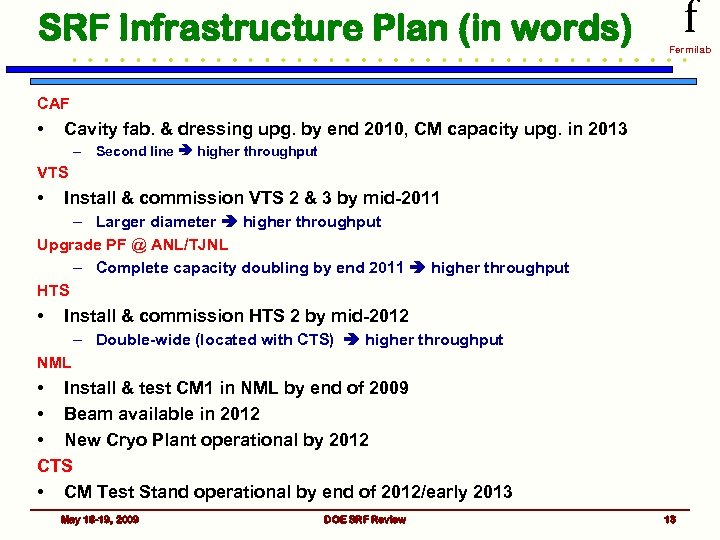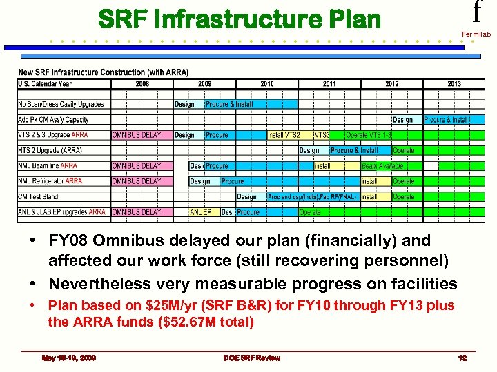 SRF Infrastructure Plan f Fermilab • FY 08 Omnibus delayed our plan (financially) and affected our work force (still recovering personnel) • Nevertheless very measurable progress on facilities • Plan based on $25 M/yr (SRF B&R) for FY 10 through FY 13 plus the ARRA funds ($52. 67 M total) May 18 -19, 2009 DOE SRF Review 12