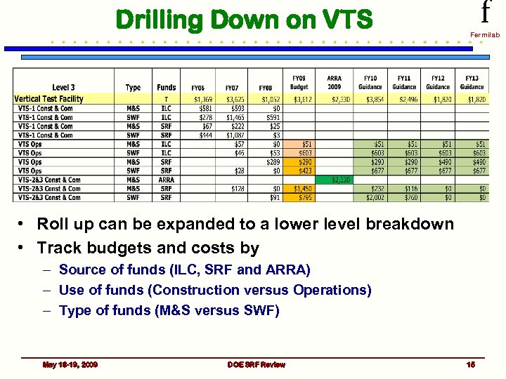 Drilling Down on VTS f Fermilab • Roll up can be expanded to a lower level breakdown • Track budgets and costs by – Source of funds (ILC, SRF and ARRA) – Use of funds (Construction versus Operations) – Type of funds (M&S versus SWF) May 18 -19, 2009 DOE SRF Review 15
