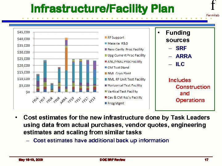 Another Example - NML f Fermilab • Simpler view for NML as there are only two sources of funding – SRF and ARRA – ARRA helps NML restore scope and catch up on FY 08 activities • NML Ops increases as additional parts of the system are commissioned May 18 -19, 2009 DOE SRF Review 16