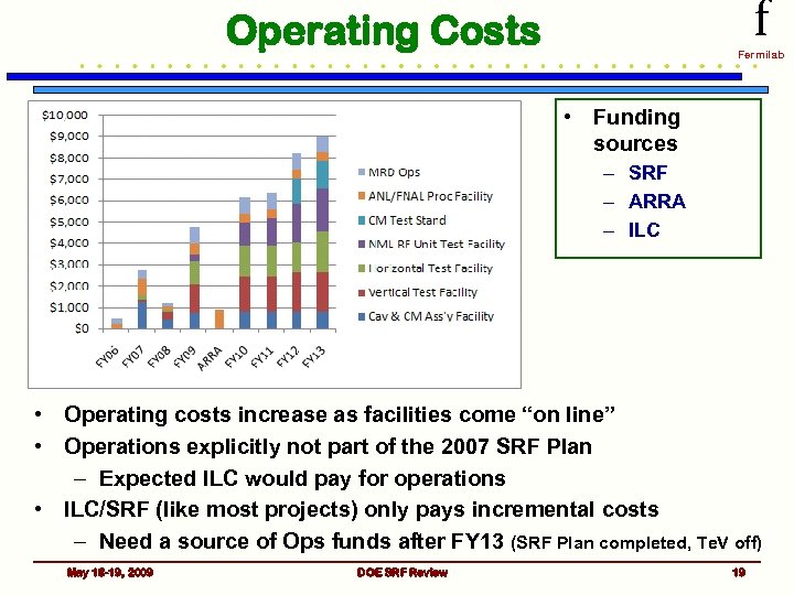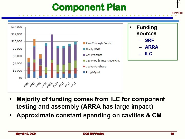 f Component Plan Fermilab • Funding sources – SRF – ARRA – ILC • Majority of funding comes from ILC for component testing and assembly (ARRA has large impact) • Approximate constant spending on cavities & CM May 18 -19, 2009 DOE SRF Review 18