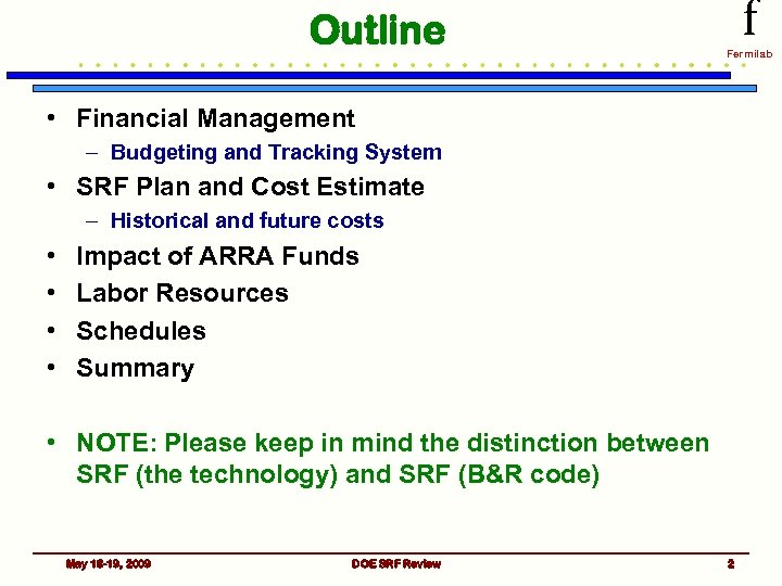 Outline f Fermilab • Financial Management – Budgeting and Tracking System • SRF Plan and Cost Estimate – Historical and future costs • • Impact of ARRA Funds Labor Resources Schedules Summary • NOTE: Please keep in mind the distinction between SRF (the technology) and SRF (B&R code) May 18 -19, 2009 DOE SRF Review 2