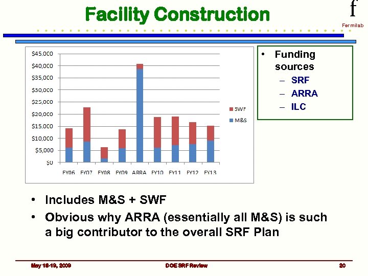 f Operating Costs Fermilab • Funding sources – SRF – ARRA – ILC • Operating costs increase as facilities come “on line” • Operations explicitly not part of the 2007 SRF Plan – Expected ILC would pay for operations • ILC/SRF (like most projects) only pays incremental costs – Need a source of Ops funds after FY 13 (SRF Plan completed, Te. V off) May 18 -19, 2009 DOE SRF Review 19