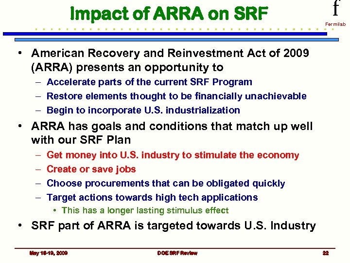 Facility Construction f Fermilab • M&S Only (incl. OH) – Actuals for FY 09 = FY 09 Budget • Actuals for CAF, VTS, HTS and EPF reflect cost of construction for operational systems – MP 9/ICB, VTS 1, HTS 1, ANL/FNAL PF – Working on cryo upgrades for VTS (IB 1) in FY 09 May 18 -19, 2009 DOE SRF Review 21