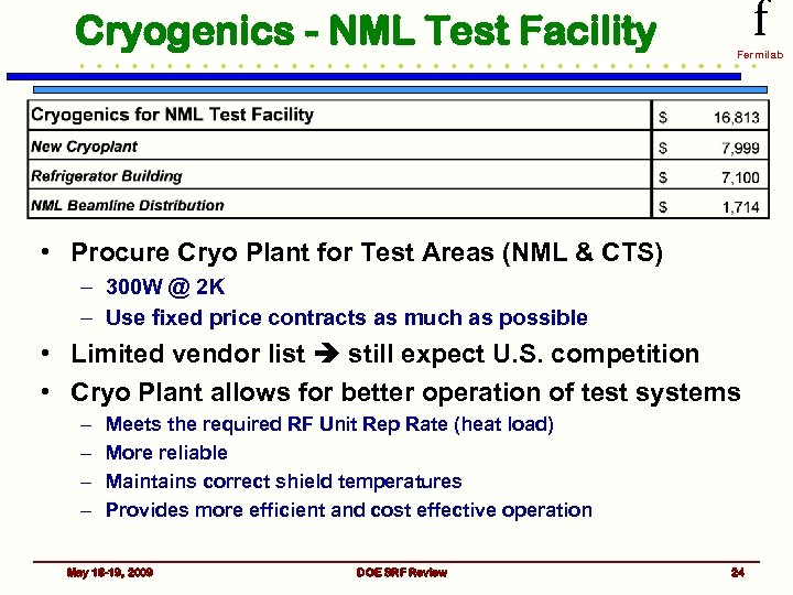 Cryogenics - NML Test Facility f Fermilab • Procure Cryo Plant for Test Areas (NML & CTS) – 300 W @ 2 K – Use fixed price contracts as much as possible • Limited vendor list still expect U. S. competition • Cryo Plant allows for better operation of test systems – – Meets the required RF Unit Rep Rate (heat load) More reliable Maintains correct shield temperatures Provides more efficient and cost effective operation May 18 -19, 2009 DOE SRF Review 24