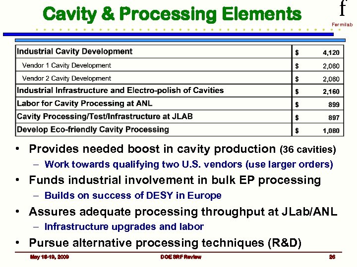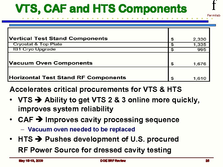 VTS, CAF and HTS Components f Fermilab Accelerates critical procurements for VTS & HTS • VTS Ability to get VTS 2 & 3 online more quickly, improves system reliability • CAF Improves cavity processing sequence – Vacuum oven needed to be replaced • HTS Pushes development of U. S. procured RF Power Source for dressed cavity testing May 18 -19, 2009 DOE SRF Review 25