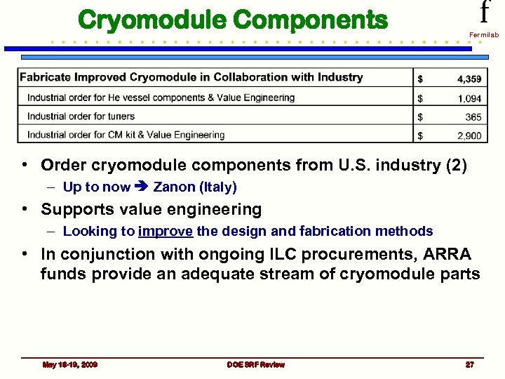 Cavity & Processing Elements f Fermilab • Provides needed boost in cavity production (36 cavities) – Work towards qualifying two U. S. vendors (use larger orders) • Funds industrial involvement in bulk EP processing – Builds on success of DESY in Europe • Assures adequate processing throughput at JLab/ANL – Infrastructure upgrades and labor • Pursue alternative processing techniques (R&D) May 18 -19, 2009 DOE SRF Review 26