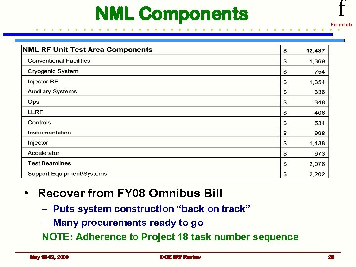 NML Components f Fermilab • Recover from FY 08 Omnibus Bill – Puts system construction “back on track” – Many procurements ready to go NOTE: Adherence to Project 18 task number sequence May 18 -19, 2009 DOE SRF Review 28