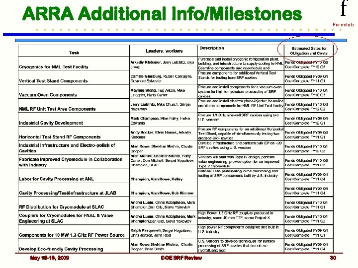 ARRA Additional Info/Milestones May 18 -19, 2009 DOE SRF Review f Fermilab 30