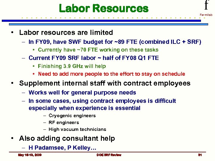 Labor Resources f Fermilab • Labor resources are limited – In FY 09, have SWF budget for ~89 FTE (combined ILC + SRF) • Currently have ~70 FTE working on these tasks – Current FY 09 SRF labor ~ half of FY 08 Q 1 FTE • Finishing 3. 9 GHz will help • Need to add more people to the effort to stay on schedule • Supplement internal staff with contract employees – Works well for general purpose needs – In some cases, using contract employees is difficult especially when experience is essential – Cryogenic engineers – RF engineers – High vacuum technicians • Also adding consultant help – H Padamsee, P Kelley… May 18 -19, 2009 DOE SRF Review 31
