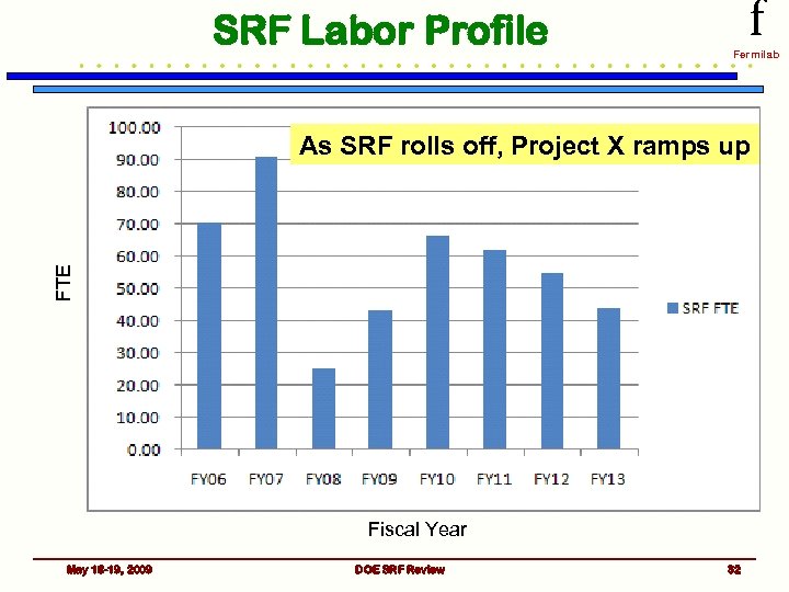 SRF Labor Profile f Fermilab FTE As SRF rolls off, Project X ramps up Fiscal Year May 18 -19, 2009 DOE SRF Review 32