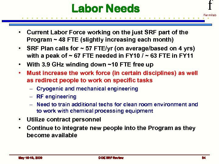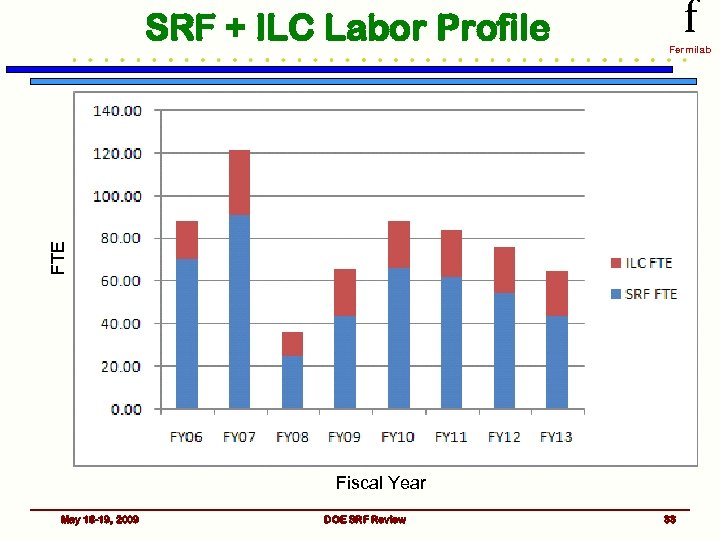 f Fermilab FTE SRF + ILC Labor Profile Fiscal Year May 18 -19, 2009 DOE SRF Review 33