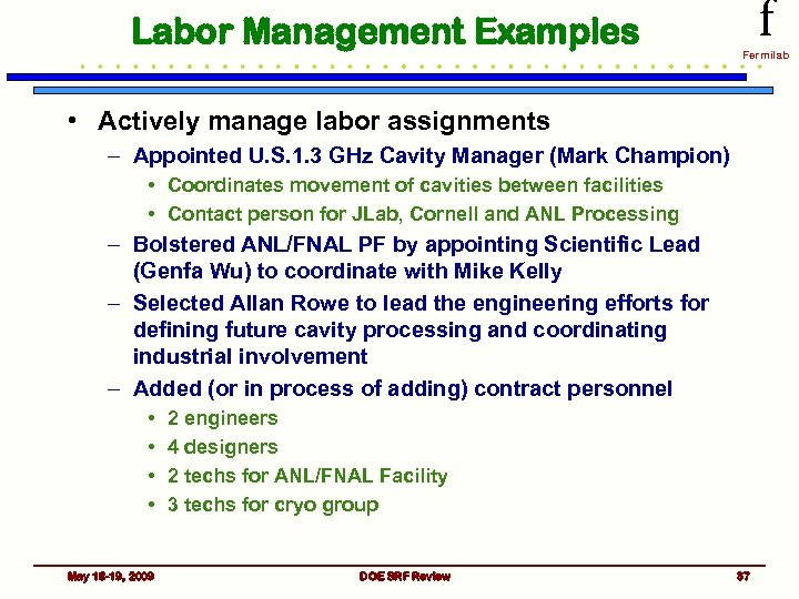 Labor Management Examples f Fermilab • Actively manage labor assignments – Appointed U. S. 1. 3 GHz Cavity Manager (Mark Champion) • Coordinates movement of cavities between facilities • Contact person for JLab, Cornell and ANL Processing – Bolstered ANL/FNAL PF by appointing Scientific Lead (Genfa Wu) to coordinate with Mike Kelly – Selected Allan Rowe to lead the engineering efforts for defining future cavity processing and coordinating industrial involvement – Added (or in process of adding) contract personnel • • May 18 -19, 2009 2 engineers 4 designers 2 techs for ANL/FNAL Facility 3 techs for cryo group DOE SRF Review 37