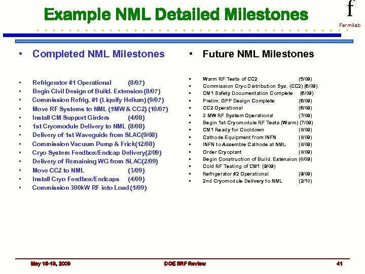 Example NML Detailed Milestones • Completed NML Milestones • • • • Refrigerator #1 Operational (8/07) Begin Civil Design of Build. Extension (8/07) Commission Refrig. #1 (Liquify Helium) (9/07) Move RF Systems to NML (5 MW & CC 2) (10/07) Install CM Support Girders (4/08) 1 st Cryomodule Delivery to NML (8/08) Delivery of 1 st Waveguide from SLAC(9/08) Commission Vacuum Pump & Frick(12/08) Cryo System Feedbox/Endcap Delivery(2/09) Delivery of Remaining WG from SLAC(2/09) Move CC 2 to NML (3/09) Install Cryo Feedbox/Endcaps (4/09) Commission 300 k. W RF into Load (5/09) May 18 -19, 2009 f Fermilab • Future NML Milestones • • • • Warm RF Tests of CC 2 (5/09) Commission Cryo Distribution Sys. (CC 2) (6/09) CM 1 Safety Documentation Complete (6/09) Prelim. GPP Design Complete (6/09) CC 2 Operational (6/09) 3 MW RF System Operational (7/09) Begin 1 st Cryomodule RF Tests (Warm) (7/09) CM 1 Ready for Cooldown (8/09) Cathode Equipment from INFN (8/09) INFN to Assemble Cathode at NML (8/09) Order Cryoplant (8/09) Begin Construction of Build. Extension (8/09) Cold RF Testing of CM 1 (9/09) Refrigerator #2 Operational (9/09) 2 nd Cryomodule Delivery to NML (2/10) DOE SRF Review 41
