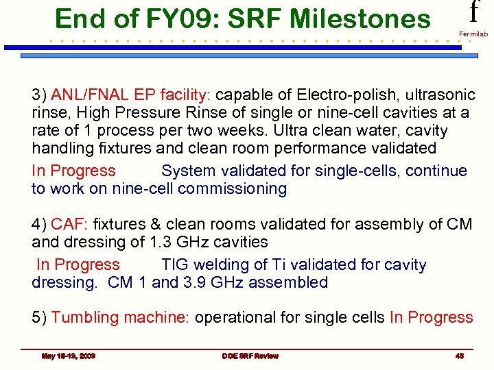 End of FY 09: SRF Milestones f Fermilab 3) ANL/FNAL EP facility: capable of Electro-polish, ultrasonic rinse, High Pressure Rinse of single or nine-cell cavities at a rate of 1 process per two weeks. Ultra clean water, cavity handling fixtures and clean room performance validated In Progress System validated for single-cells, continue to work on nine-cell commissioning 4) CAF: fixtures & clean rooms validated for assembly of CM and dressing of 1. 3 GHz cavities In Progress TIG welding of Ti validated for cavity dressing. CM 1 and 3. 9 GHz assembled 5) Tumbling machine: operational for single cells In Progress May 18 -19, 2009 DOE SRF Review 43