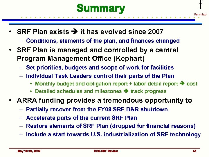 Summary f Fermilab • SRF Plan exists it has evolved since 2007 – Conditions, elements of the plan, and finances changed • SRF Plan is managed and controlled by a central Program Management Office (Kephart) – Set priorities, budgets and scope of work for facilities – Individual Task Leaders control their parts of the Plan • Monthly budget and obligation report + labor detail report cost • Detailed schedules and milestones track progress • ARRA funding provides a tremendous opportunity to – – Partially recover from the FY 08 SRF B&R shutdown Accelerate parts of the current SRF Plan Restore elements of SRF Plan (dropped for financial reasons) Include a start towards U. S. industrialization of SRF technology May 18 -19, 2009 DOE SRF Review 45