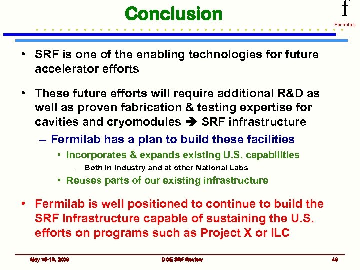 Conclusion f Fermilab • SRF is one of the enabling technologies for future accelerator efforts • These future efforts will require additional R&D as well as proven fabrication & testing expertise for cavities and cryomodules SRF infrastructure – Fermilab has a plan to build these facilities • Incorporates & expands existing U. S. capabilities – Both in industry and at other National Labs • Reuses parts of our existing infrastructure • Fermilab is well positioned to continue to build the SRF Infrastructure capable of sustaining the U. S. efforts on programs such as Project X or ILC May 18 -19, 2009 DOE SRF Review 46