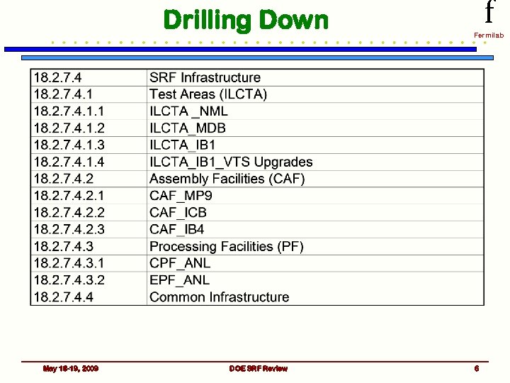 SRF Task Numbers f Fermilab • Set up as a high level WBS – Allows for better planning and tracking • M&S and SWF are budgeted and tracked separately • At lowest level, task numbers differentiate by Division – Labor Report gives names of individuals charging to tasks • Monthly Reports are generated and available (Dirserver) • SRF Financial Officer is Connee Trimby May 18 -19, 2009 DOE SRF Review 5