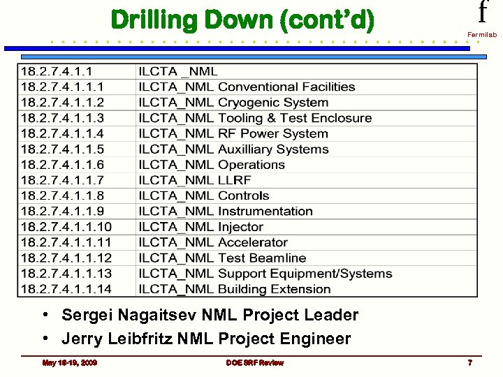 Drilling Down (cont’d) f Fermilab • Sergei Nagaitsev NML Project Leader • Jerry Leibfritz NML Project Engineer May 18 -19, 2009 DOE SRF Review 7