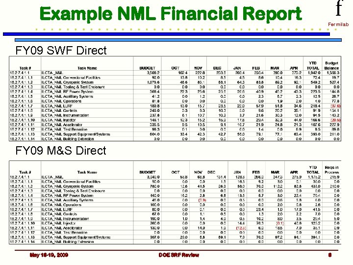 Example NML Financial Report f Fermilab FY 09 SWF Direct FY 09 M&S Direct May 18 -19, 2009 DOE SRF Review 8