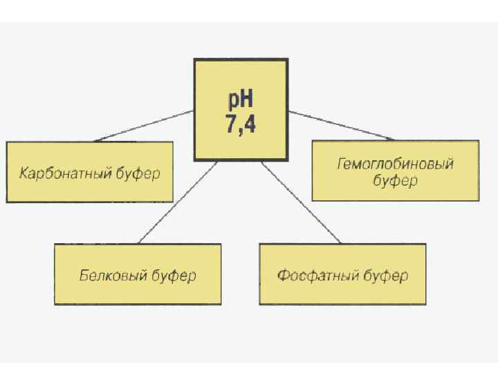 Регуляция постоянства р. Н крови: Гемические механизмы: деятельность гемоглобинового, бикарбонатного, белкового, фосфатного буферов плазмы и эритроцитов (общая буферная мощность 48 ммоль/л крови); Висцеральные механизмы (основные): - выведение через легкие около 17 000 моль СО 2 (потенциального донора Н+) в сутки; - через почки примерно 70 ммоль Н+ в сутки (эквивалентно суточной продукции «нелетучих» кислот - серной, фосфорной и др. ).