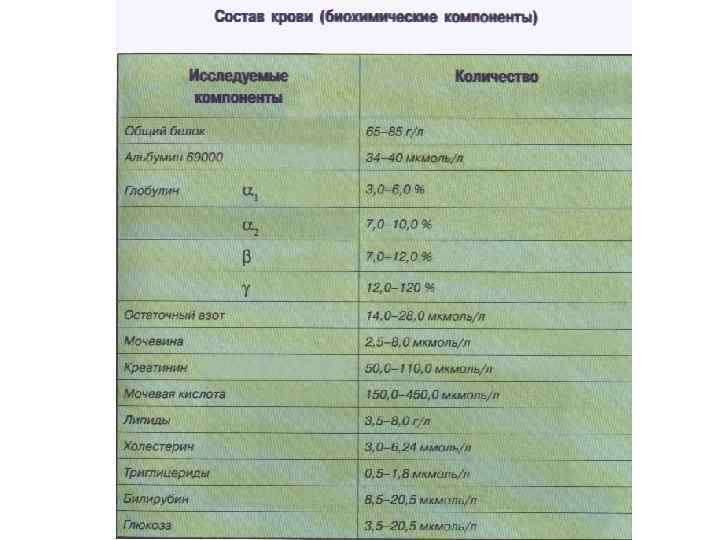 Состав плазмы крови - 90 -92% воды (900 – 910 г/л); - 8 -10% сухого остатка (в основном белки и соли); - белки – 65 – 85 г/л; - альбумины – 38 -50 г/л; - альфа 1 -глобулины – 1, 4 -3, 0 г/л; - альфа 2 -глобулины – 5, 6 -9, 0 г/л; - бетта - глобулины – 5, 4 -9, 0 г/л; - гамма - глобулины – 9, 0 -14, 5 г/л; - фибриноген – 2, 0 -4, 0 г/л; - билирубин общий – 3, 4 -22, 0 ммоль/л; - липиды, ЛПОНП, ЛПВП; - глюкоза – 3, 6 -6, 5 ммоль/л; - мочевая кислота, натрий, кальций, магний, фосфат, железо общее, медь общая, креатинин и т. д. Осмотическое давление плазмы крови - 7, 3 – 7, 6 атм. (5600 мм. рт. ст. ). Онкотическое давление - не превышает 25 -30 мм. рт. столба.