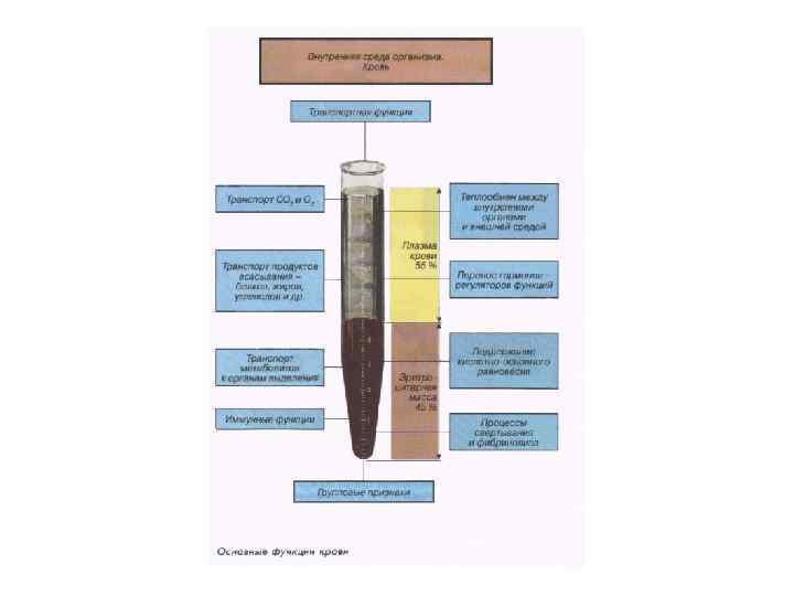 Функции крови - транспортная - перенос необходимых веществ, газов и т. д. ; - экскреторная функция; - дыхательная; - питательная (трофическая); - гомеостатическая; - регуляторная – сохранение постоянства внутренней среды организма, водного и солевого баланса, температуры тела, регуляция гемопоэза и т. д. ; - терморегуляторная; - защитная - (специфическая – иммунитет) и неспецифическая (фагоцитоз) защита организма; свертывание крови; - участие в креаторных связях.