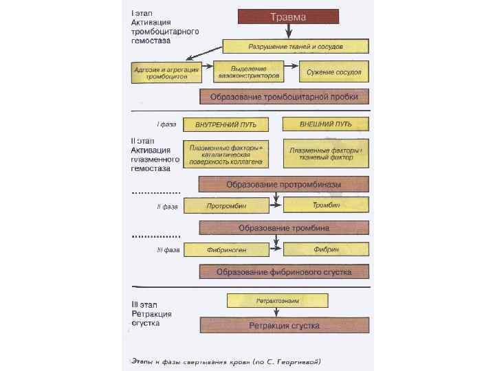 ГЕМОСТАЗ сложная система приспособительных механизмов, обеспечивающих текучесть крови в сосудах и свертывание ее при нарушении их целостности Фазы (стадии) - префаза (сосудисто-тромбоцитарный гемостаз или микроциркуляторный или гемостаз в сосудах с низким АД); - образование протромбиназы; - образование тромбина; - образование фибрина; - послефаза (ретракция и фибринолиз).