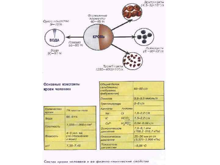 Состав крови гематокрит - (20 - 29 лет у женщин 32, 0 - 44, 5 у мужчин 38, 0 - 49, 0 форменных элементов и остальное - плазмы); Количество крови - 6 -8% или 1/13 часть массы тела у взрослого и 8 -9% у детей - нормоволемия, гипо- и гиперволемия или плетора. Вязкость плазмы 1, 7 -2, 2; цельной крови – 4, 5 -5, 0 (при вязкости воды 1); удельный вес - цельной крови - 1, 05 -1, 06; плазмы - 1, 025 - 1, 034; р. Н крови - в среднем 7, 36+ 0, 03; р. Н артериальной крови - 7, 4; р. Н венозной - 7, 34;
