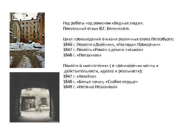 Год работы над романом «Бедные люди» . Похвальный отзыв В. Г. Белинского. Цикл произведений о жизни различных слоев Петербурга: 1846 г. Повести «Двойник» , «Господин Прохарчин» 1847 г. Повесть «Роман в девяти письмах» 1848 г. «Ползунков» Повести о «мечтателях» ( о противоречии мечты и действительности, идеала и реальности): 1847 г. «Хозяйка» 1848 г. «Белые ночи» , «Слабое сердце» 1849 г. «Неточка Незванова»