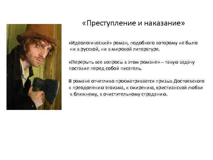 «Преступление и наказание» «Идеологический» роман, подобного которому не было ни в русской, ни в мировой литературе. «Перерыть все вопросы в этом романе» – такую задачу поставил перед собой писатель. В романе отчетливо просматривается призыв Достоевского к преодолению эгоизма, к смирению, христианской любви к ближнему, к очистительному страданию.